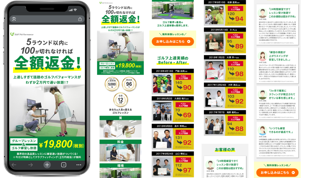 ファーストビューでは、サービスの最大訴求ポイントである「全額返金保証」を強く打ち出し、ひと目見てアピールポイントが伝わるコピー構成に設計。